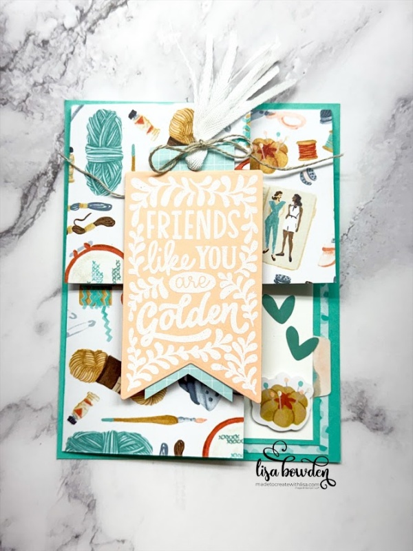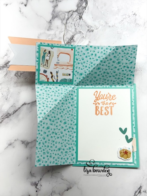 Now, turn the DSP over (the way you actually want your card to lay), and the corner will naturally told toward you, making that cool corner fold! It is so neat! Once the DSP is in the fun fold format, I layered it onto a piece of Coastal Cabana cardstock, measuring 4-1/4″ x 5-1/2″. Here’s how I dressed up the rest of the card.