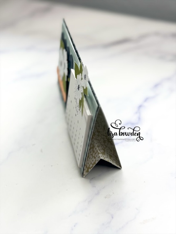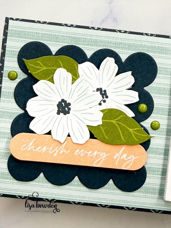 I die cut out the cute little circles using the Lovely Arrangements dies and Secret Sea cardstock, and I trimmed it down to fit the space. Isn’t that background die cool??