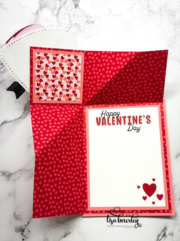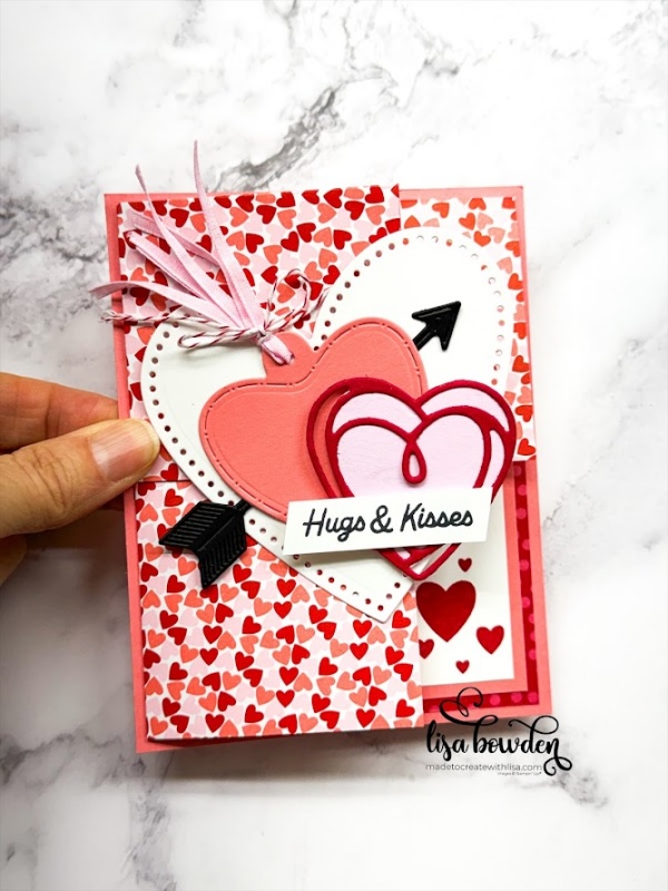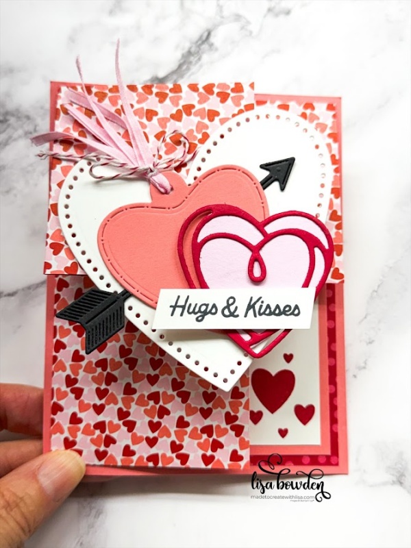 The outside of the card is decorated with lots of die cuts from the Endless Love die set. I used Basic white, Flirty Flamingo, Bubble Bath, Real Red, and Basic Black cardstocks. I added a Bubble Bath ribbon accent, tied with a Red & White Twine bow. I stamped the sentiment with Black Memento ink, and layered all of these hearts up and attached it to the card front. I LOVE how it looks!