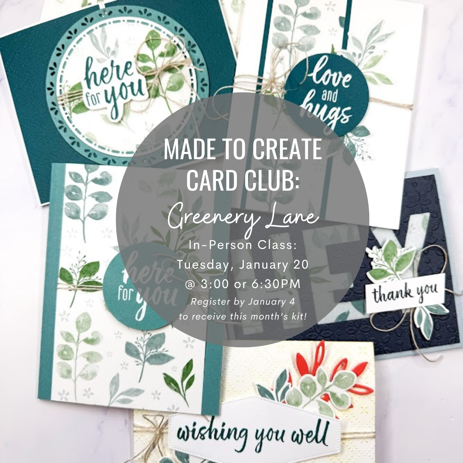 January’s In-Person, local card classes will take place on Tuesday, January 20 (3-5pm -OR- 6:30-8:30pm) at Lisa’s home studio (address released upon registration). January’s Monthly Card Class features the beautiful new Greenery Lane bundle, which includes some amazing Washi Tape! You will receive the supplies to make 5 different projects (5 card layouts). You’ll also go home with a roll of the new Greenery Lane Washi Tape and a spool of Linen Thread.