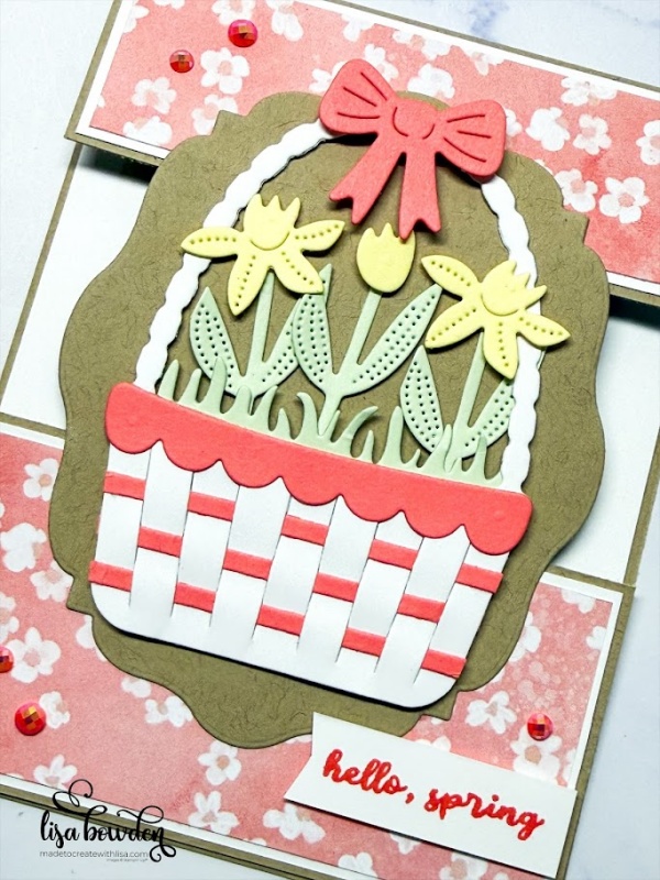 I layered up lots of die cuts from here. I die cut out the Easter basket from Basic White cardstock, the woven strips to weave into the basket with Flirty Flamingo cardstock, and the same color for the basket ruffle and the bow. I also die cut out the Easter grass and the flower stems from Soft Sea Foam cardstock, and then added the daffodils die cut out of Lemon Lolly cardstock. I used both Liquid Glue and Stampin’ Dimensionals to put together the whole “scene,” and I love how it turned out!