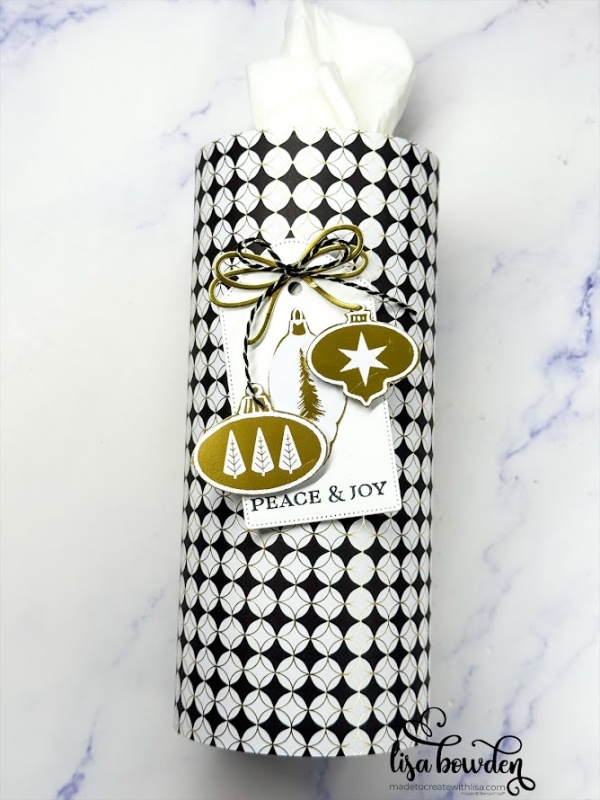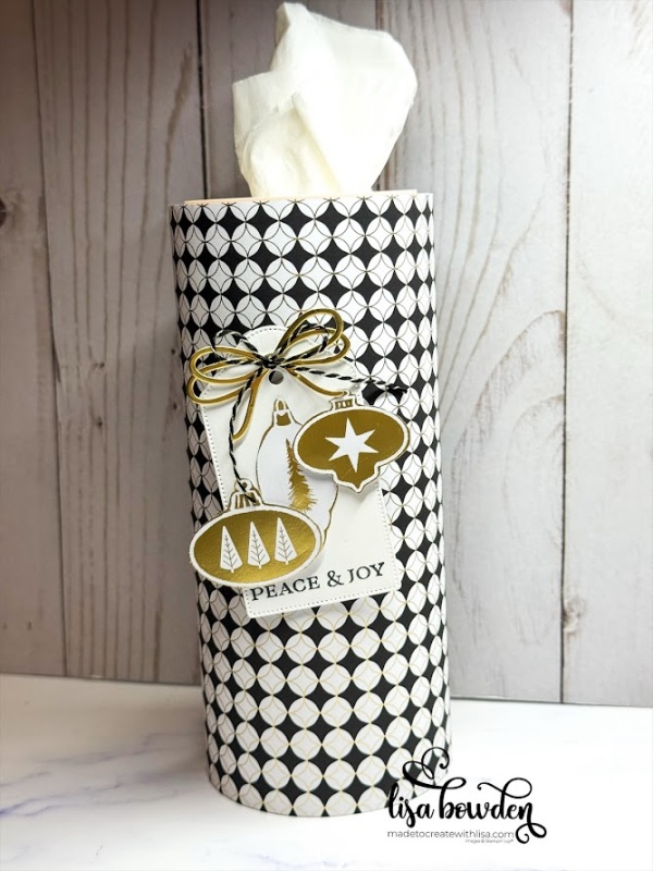 I started out by choosing one of the prints from the Modern Christmas Designer Series Paper that I thought would be perfect. I measured the height of the Kleenex box, wrapped it around so I would know how long I need, and cut it. Then, I used Tear & Tape adhesive to adhere it nice and tight. PLEASE CLICK HERE to watch the video where I made this fun project.