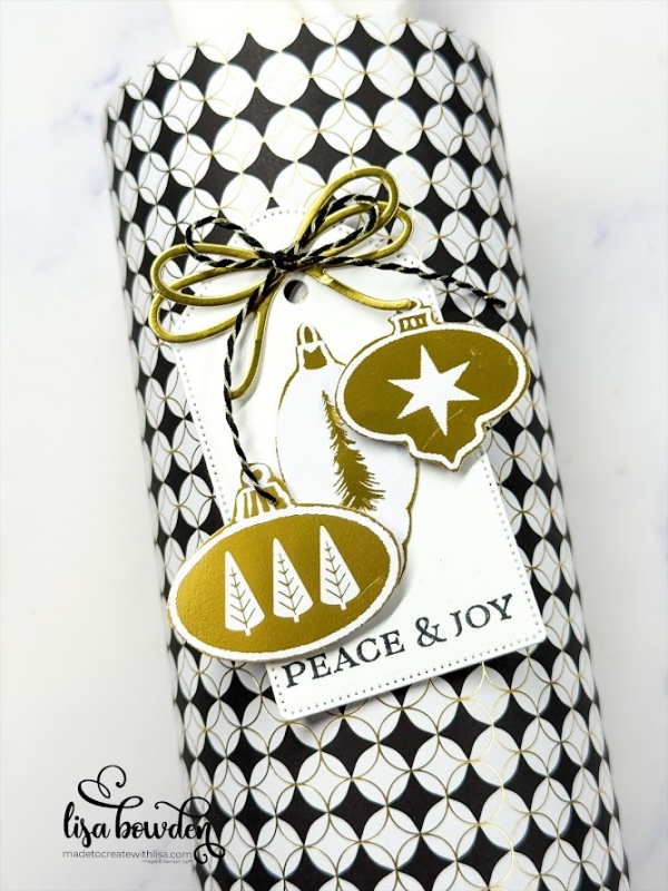 I stamped the sentiment on the bottom using my Black Memento ink pad, choosing to only stamp part of one of the sentiments from the Modern Christmas stamp set. Then, I hand cut out several ornaments from the Designer Series Paper pack, and arranged them onto the tag using Stampin’ Dimensionals.