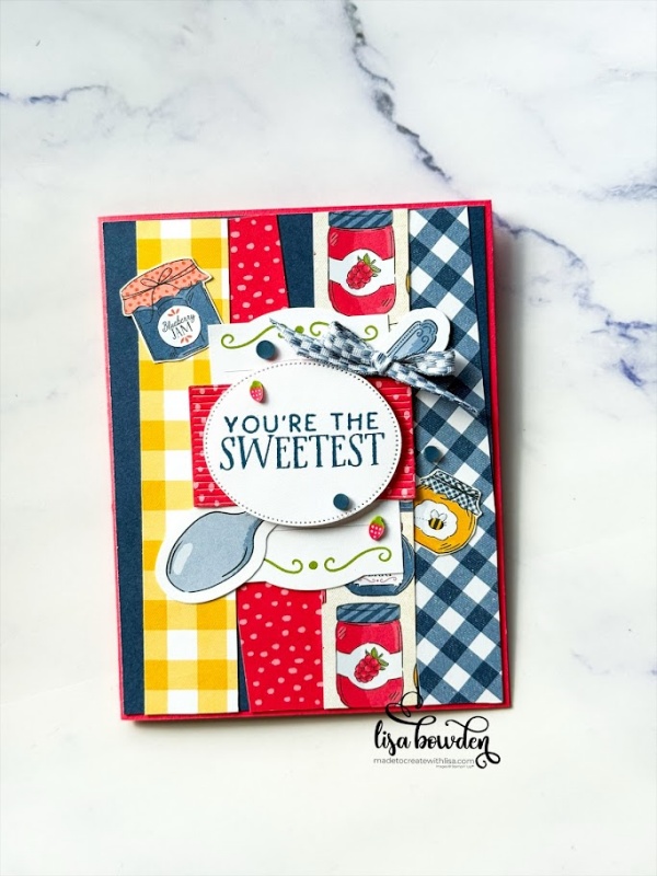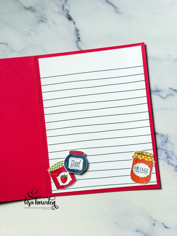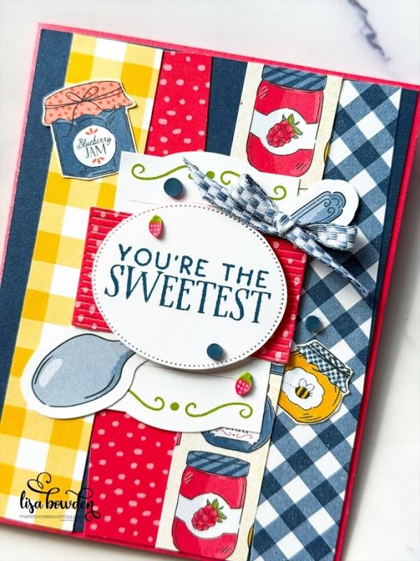 I laid the strips at different angles, to give the card front some interest. I also layered some of the stickers from the kit, as well as a couple of dies from the Filled with Sweetness die set. I added a bow, and then finished off the card by hand cutting out a few of the darling little jars of jam.