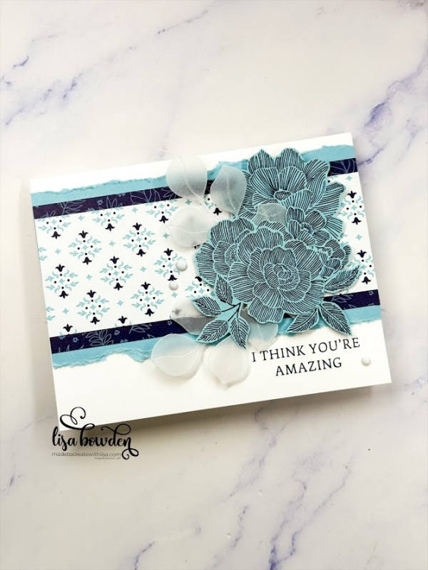 This card layout is easy yet so pretty, and it’s a layout that you can create with all different kinds of papers. I started with a Basic White card base, measuring 5-1/2″ x 8-1/2″ and folded in half. Layered on top of that is a piece of Balmy Blue cardstock, measuring 3-1/4″ x 5-1/2″. I carefully ripped both edges, and layered this onto the card base.