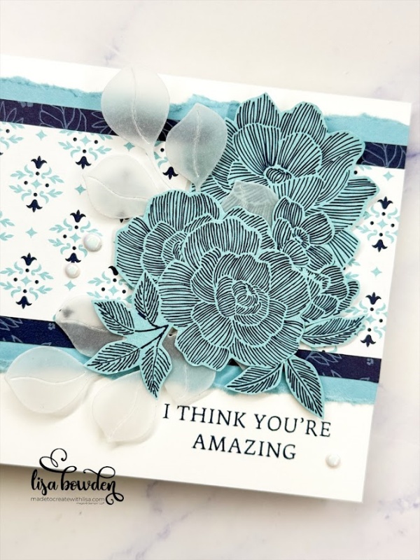 I finished off the card by hand-cutting out some of the flowers directly from one of the sheets of DSP, and layering them all up. I also die cut out some leaves from the Petals of Beauty die set, using Vellum Specialty Paper (YAY!!! We have vellum again!!!). I *LOVE* how the vellum layers up with the blues and whites, making it automatically dressier and fancier. Don’t you think??